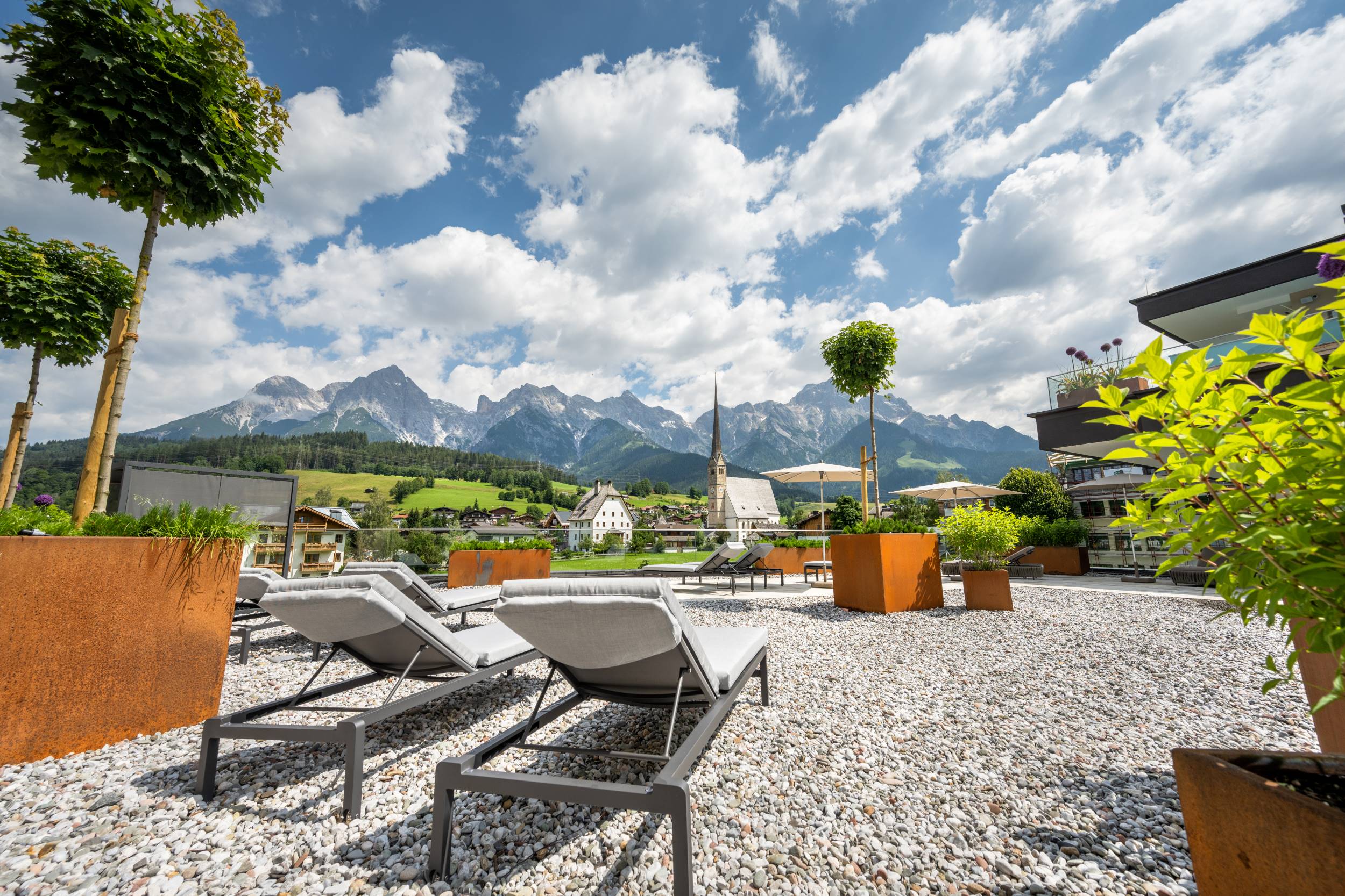 From the panoramic saunas guests enjoy from the magnificent view of the Maria Alm pilgrimage church, which is considered one of the most beautiful shrines to Virgin Mary in the Salzburger Land. Adventure showers provide a burst of freshness after a sauna session.